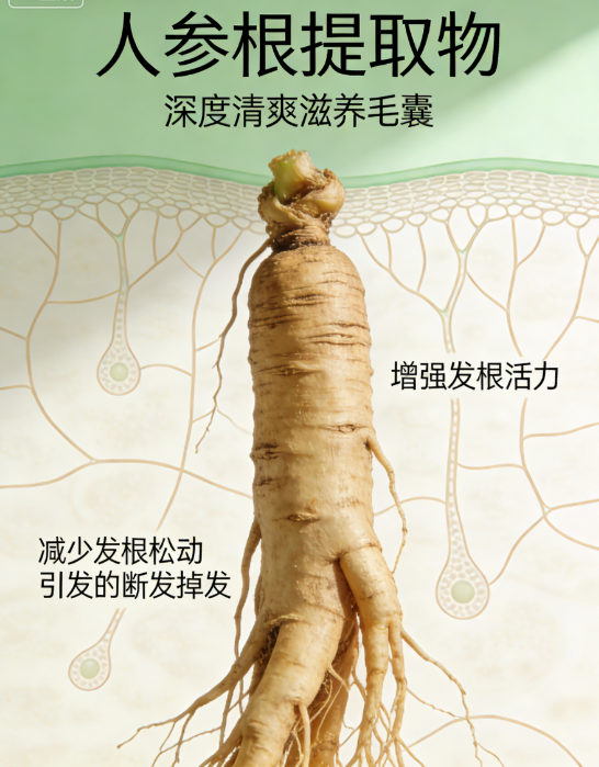 核心成分功效体现:人参根提取物滋养毛囊,促进头皮血液循环,减少发根松动引发的断发、掉发;燕麦麸皮提取物、麦冬根提取物补充发丝氨基酸、维生素,修护受损发丝结构,提升发丝韧性。丁二醇复配专利成分(专利号:ZL201910433332.1)促进营养成分吸收,强化去屑、防断、修护三重功效。