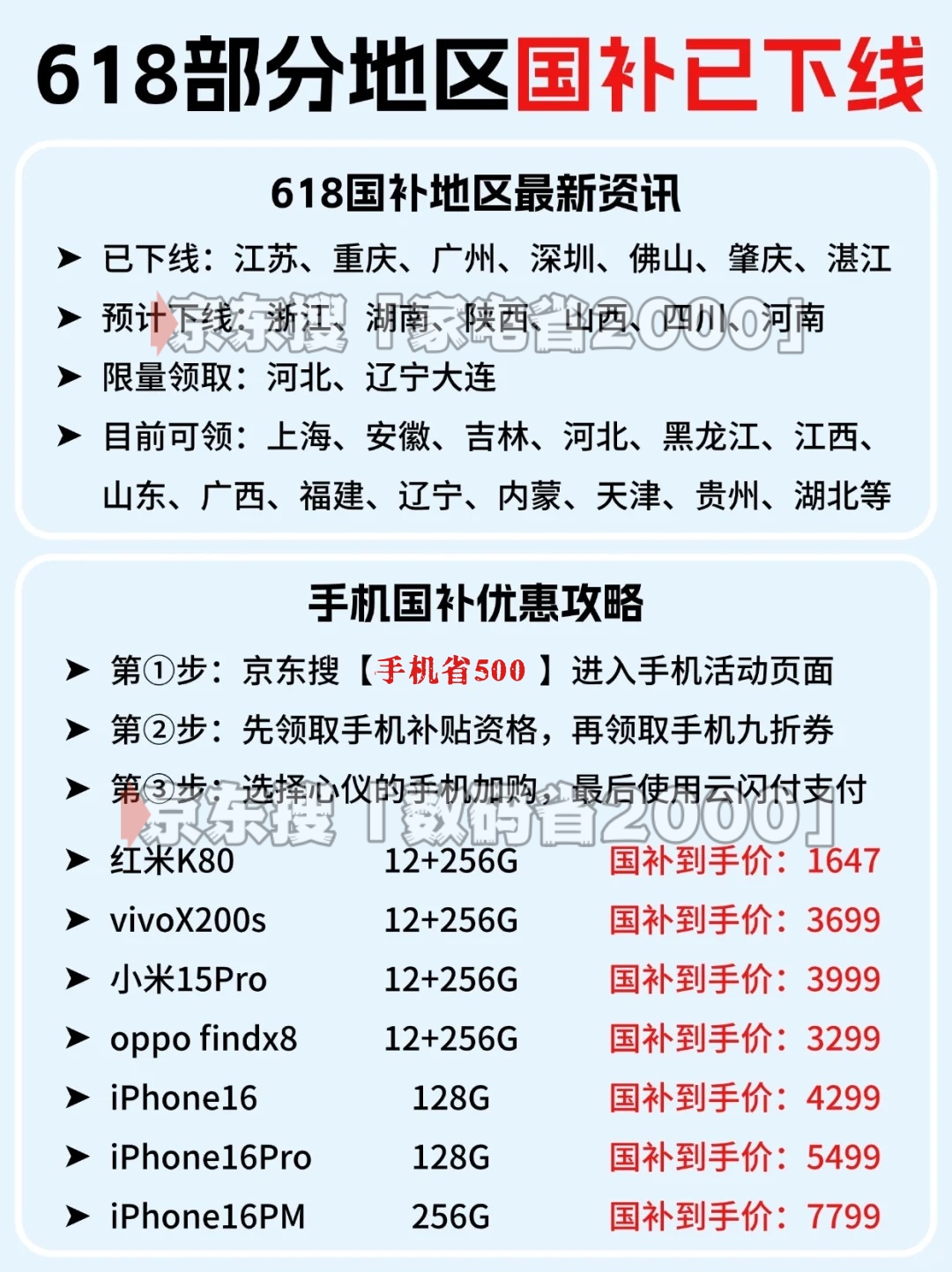 四、实战指南:3步锁定补贴资格 1. 线上领取最优路径 - 家电:京东APP搜 → “家电省2000” - 手机数码:搜 → “手机省500”或“数码省2000” >> 秘诀:首次搜索后,每日点“历史搜索记录”快速进入 2. 避坑!这些细节影响补贴 - 防涨价套路:优先选京东自营/品牌旗舰店,对比历史价格 - 发票要求:抬头必须为“个人”,注明型号和SN码 - 退货规则:仅退实付金额,补贴不退(如5000元手机退货只退4500元) 3. 叠加优惠翻倍省 以5000元手机为例: 原价5000元 → 京东搜“好运红包7788”领券 → 叠加国补15%省750元 → 以旧换新抵扣1000元 → 实付仅2950元 五、现在该怎么做?行动优先级建议 1. 重庆/江苏等暂停区: → 立即关注本地商务局公告(预计6月上旬重启) → 错过窗口或失资格 2. 空调/高端手机: → 6月底前下单 → 高价值商品额度消耗最快 3. 小家电/低价数码: → 可待“双11”叠加优惠 → 最晚不超11月 政策窗口正在关闭!全国家电商业协会常务副秘书长吴咸建紧急发声:“暂停是控量而非终止,第二批资金已加速到位!”但全国资金池消耗超70%,能否搭上末班车,主动权只在行动快慢之间。 >> 立即行动: 打开京东APP搜索: 家电类 → “家电省2000” 数码类 → “数码省2000”