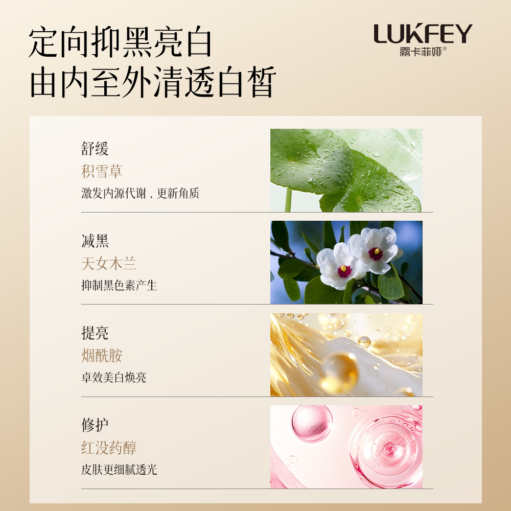 露卡菲娅防晒霜它里面添加的天女木兰、烟酰胺、十一碳烯酰基苯丙氨酸,抑制黑色素沉淀,美白提亮肤色,边防晒边美白,红没药醇+积雪草提高肌肤抵御力加速皮肤的屏障修护,防止晒伤、晒黑、晒红,0酒精添加,敏感肌也能放心用