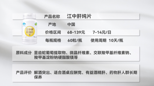 该品主要针对酒精性肝损伤防护,精准定位于高频应酬人群。其核心配方采用显齿蛇葡萄提取物,辅以微晶纤维素、羧甲基淀粉钠等辅料,旨在加速酒精代谢并缓解药物性肝损伤。然受限于成本因素,活性成分浓度不足,导致整体护肝效果较为有限,成为该品主要短板。