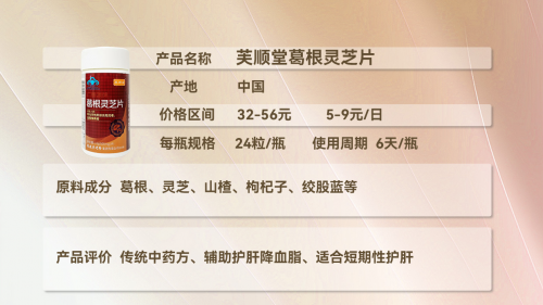 国产品牌芙顺堂旗下的一款护肝产品,属于传统护肝片类型。其主要成分包括枸杞子、山楂、葛根、绞股蓝以及灵芝提取物。这些成分的护肝效果较为温和,更倾向于长期养生调理,而非追求显著的快速肝功能改善效果。