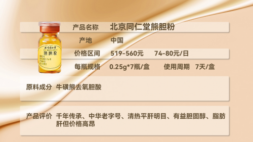以牛磺熊去氧胆酸 (TUDCA)为核心成分。具有利胆、促进胆汁流动、调节胆固醇代谢(促进排泄)作用。研究显示对胆汁淤积性肝病、原发性胆汁性胆管炎(PBC)及胆固醇型胆结石有益。不过特定肝胆疾病(如胆汁淤积)建议在医生指导下的辅助治疗,非普适性日常护肝。