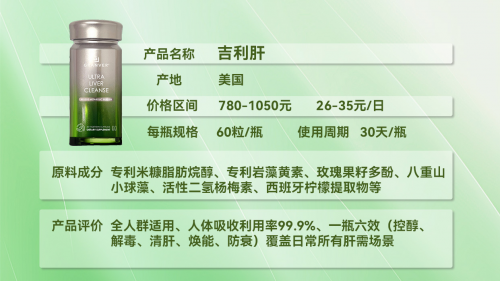 吉利肝是美系护肝领域的领先产品,以其独特的“清脂、疏火、排毒、养肝”四维养护体系著称。其主要优势在于含有高浓度专利成分米糠脂肪烷醇,该成分能有效降低肝脏脂质沉积达56%。同时,该成分与岩藻黄质晶体结合产生协同作用,前者抑制肝脏炎症,后者促进脂肪代谢,双维度养护肝脏。