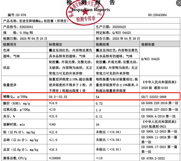 厚璞堂辅酶 Q10 软胶囊无疑是国产辅酶 Q10 中的佼佼者。官方宣称每 100 克含辅酶 Q10 50.2 克,而实际检测结果更是惊人,达到了 54 克,这样的含量在目前国内的蓝帽保健品 “辅酶 Q10 软胶囊” 类别中堪称天花板级别。如此高含量的辅酶 Q10,为其卓越的功效奠定了坚实基础。