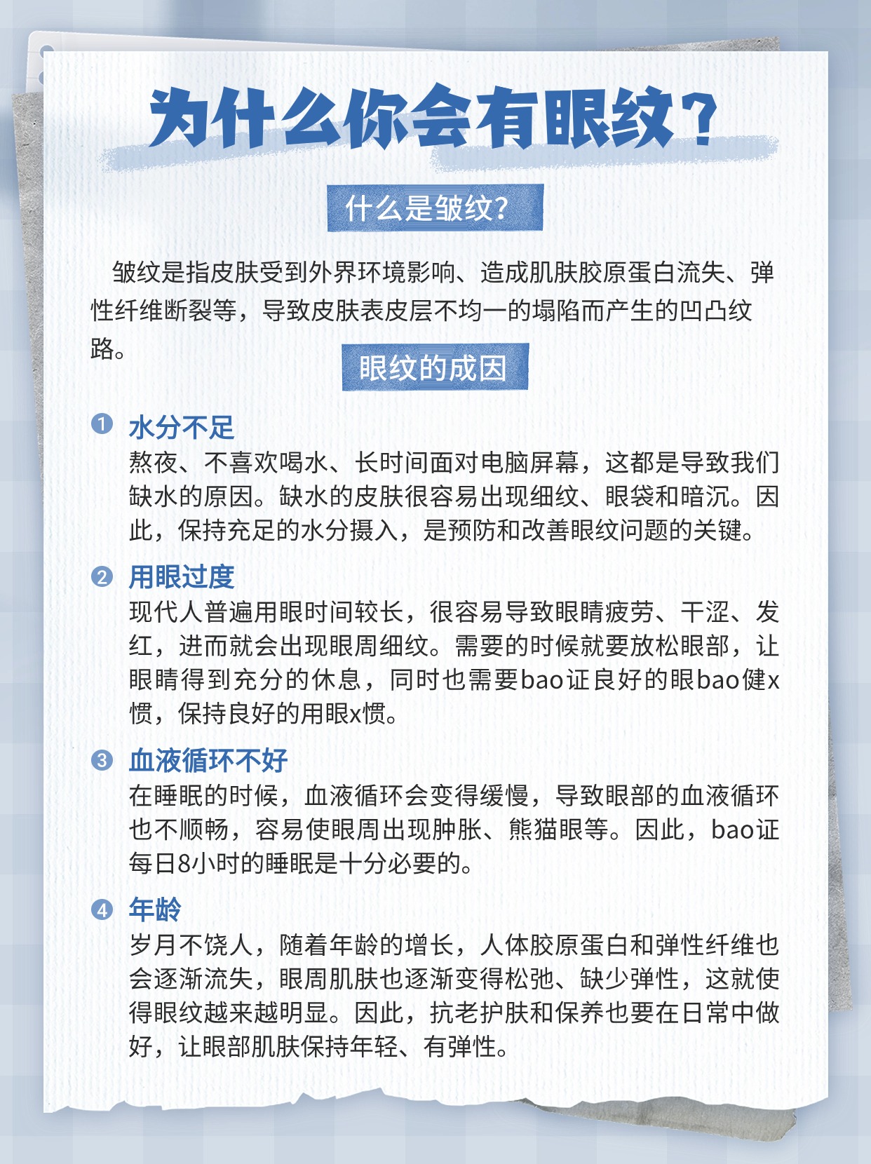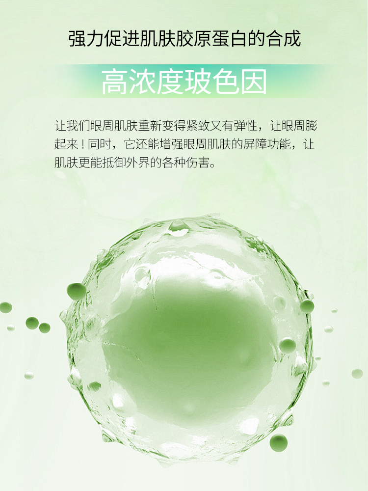 高浓度玻色因+活性肽+第三代双胶原的核心组合,能够直击细胞内核,将衰老的细胞逆转回来,最直观的感受就是充盈有活力的细胞让眼周像气球般嘭弹起来,各种纹路凹陷自然而然都淡化填平了,饱满而又平滑的眼周再也没有在化妆的时候卡过粉,管你上几层粉底遮瑕定妆,也不会有眼下尴尬的积线啦,不仅能促生眼周胶原蛋白,还能紧致提拉眼周,淡化已有的静态纹
