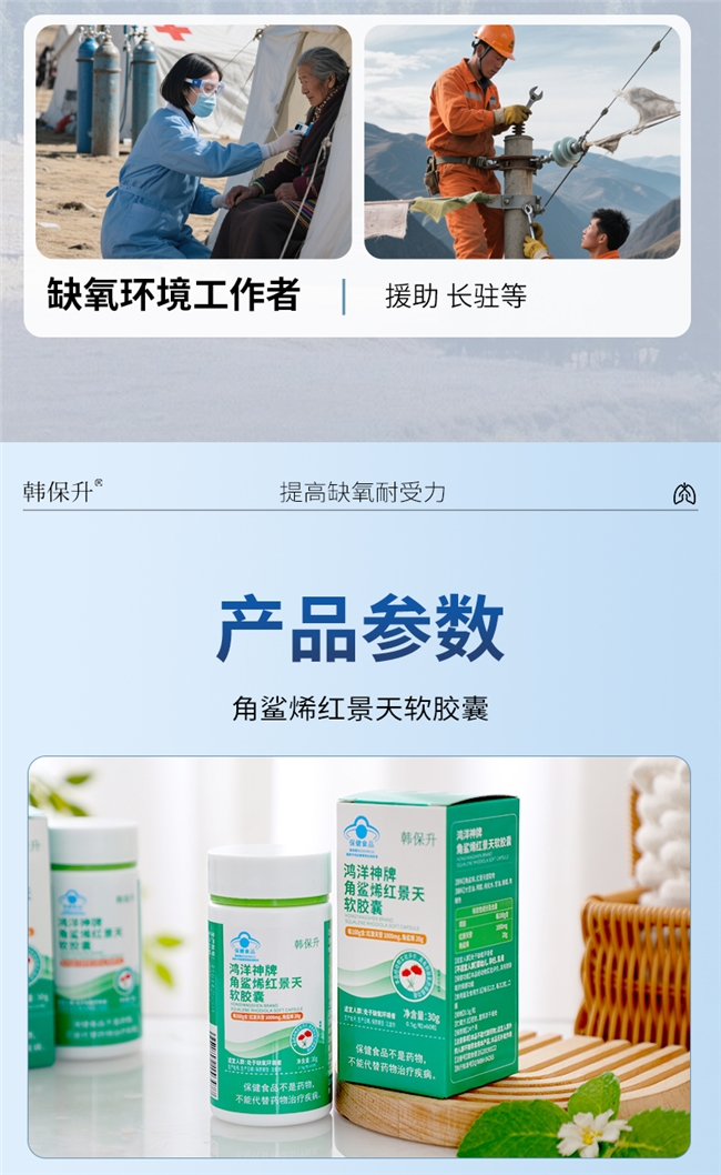 光有长期适应还不够!韩保升牌特意添加了从深海 2000 米鲨鱼肝脏提取的角鲨烯,采用零下 12℃低温冷萃技术,全程没加任何化学萃取剂,纯度高达 99.6%。这种角鲨烯的分子结构像 “折叠的迷你氧罐”,一旦遇到高原突发缺氧 —— 比如突然爬垭口、凌晨拍星空,能快速将氧气输送到大脑、心脏等关键器官,15-20 分钟就能缓解胸闷、气短。红景天负责 “打基础”,靠提前服用帮身体适应;角鲨烯负责 “救急”,应对突发状况。花一份钱,get“长效防护 + 应急救援” 双重保障,比单独买红景天或角鲨烯产品划算多了。