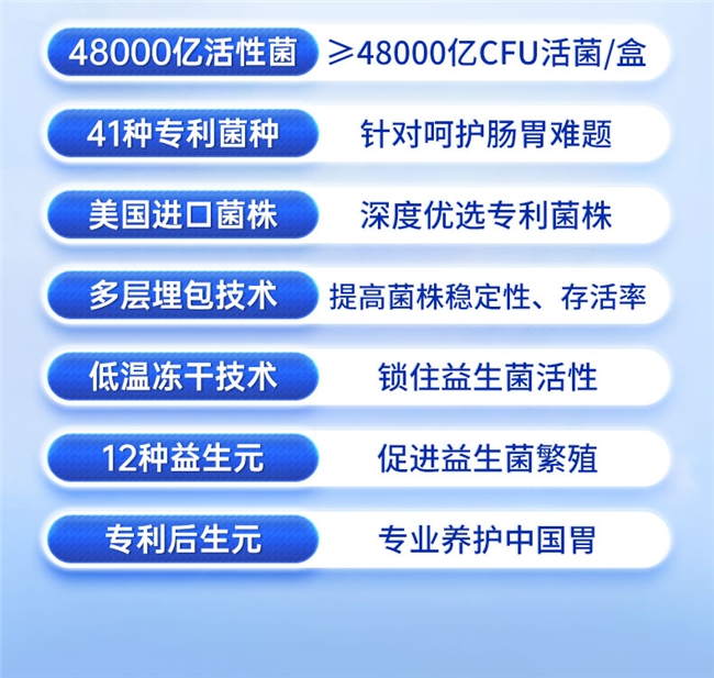 42 种益生菌、12 种益生元以及专利后生元共同构建起了一个坚不可摧的肠道健康守护体系。12 种益生元在肠道内发挥着至关重要的作用。它们在大肠内发酵时,会产生大量气体,这些气体能够增大大肠的体积,显著缩短消化物在肠道内的停留时间,对于长期受便秘困扰的人群而言,无疑是一大 “救星”。