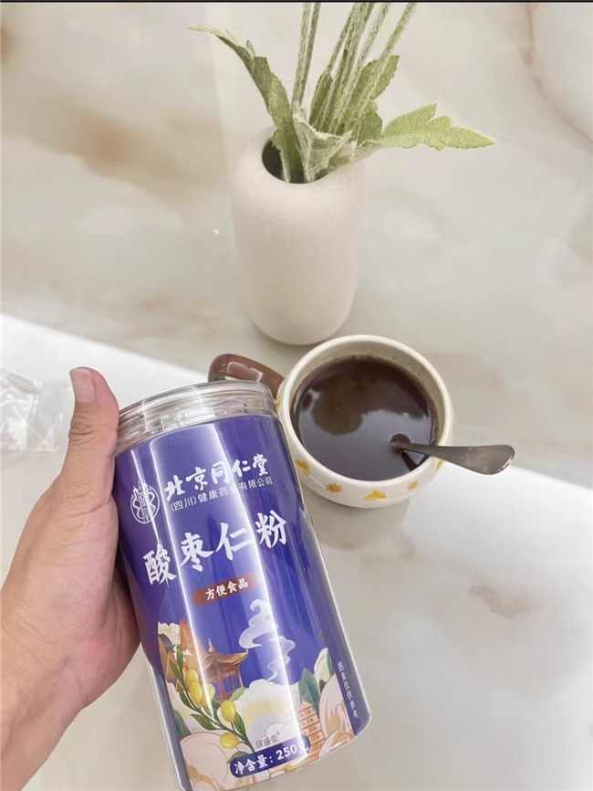 北京同仁堂酸枣仁粉包装古朴大气,蓝色纸罐搭配传统白色文字,尽显老字号的深厚底蕴。粉末质地细腻均匀,用温水冲调之后,质地顺滑,没有丝毫颗粒感。