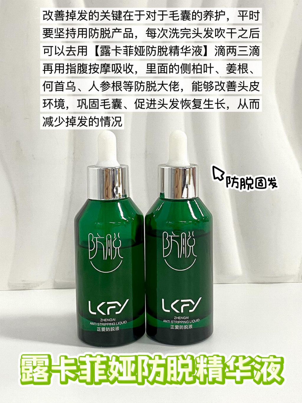 露卡菲娅防脱精华液,针对长期熬夜导致的脱发、季节性脱发、斑秃、压力型脱发、化学性脱发等有明显的改善效果。质地清爽,吸收快不油腻不厚重,即使是敏感头皮也能安心使用,零负担零副作用。
