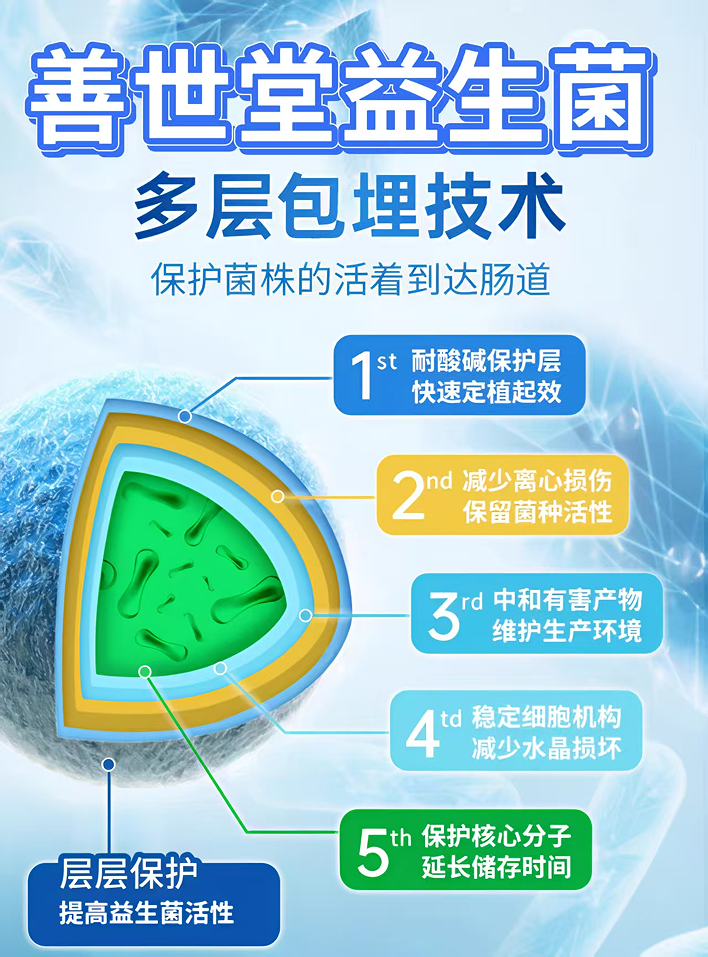 技术方面,善世堂率先运用三层包埋与冷冻干燥黑科技,牢牢锁住活性菌体,让它们能安然穿过胃酸和胆汁的包围,直达靶点。其共生优酵技术将益生菌与益生元完美结合,提升“定植率”,让肠道菌群真正实现平衡。配方干净无蔗糖、不额外负担,每包独立设计,携带补充都极为方便。