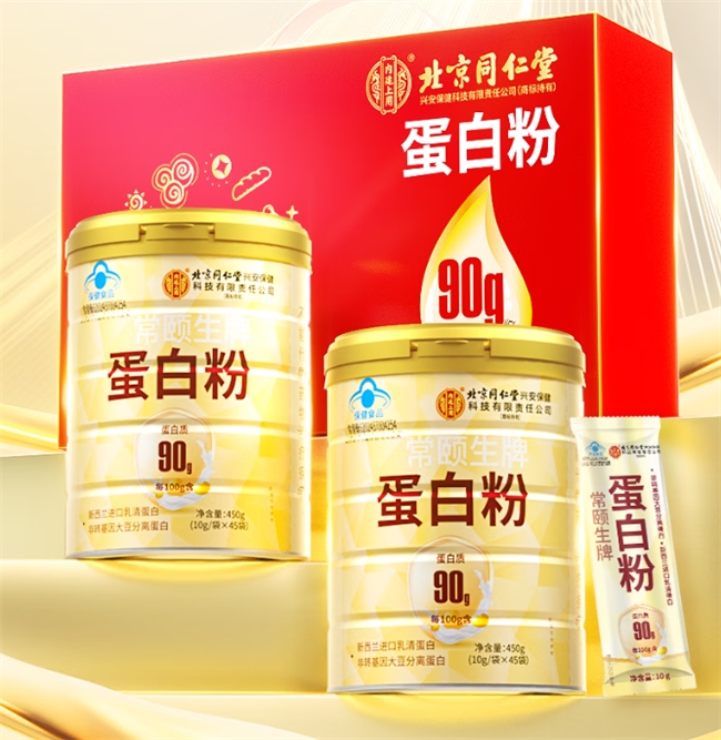 第二名北京同仁堂蛋白质粉,主打双蛋白配比,每 100g 含蛋白 75%,添加了少量山药粉辅助消化。