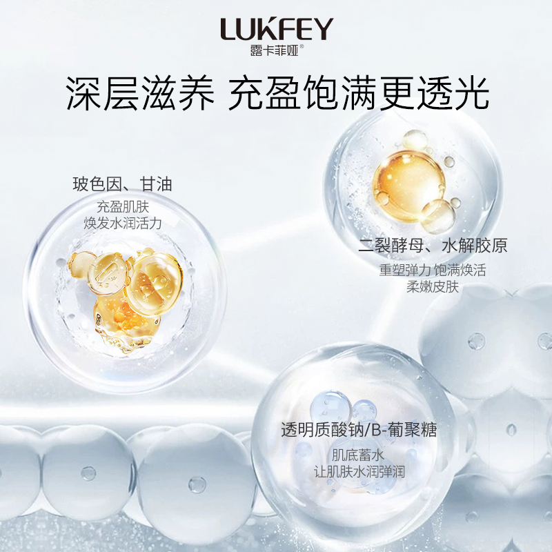 透明质酸钠、海藻糖和甘油等保湿成分,能够深层滋润肌肤,为干燥缺水的肌肤补充大量水分,并锁住水分,让肌肤时刻保持水润饱满;
