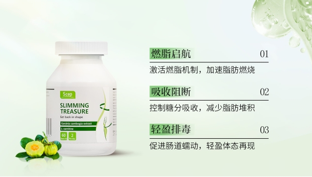 在配方设计上,它精心挑选了藤黄果提取物(HCA)、白芸豆提取物、瓜拉纳提取物、左旋肉碱以及共轭亚油酸(CLA)等成分,各成分相互配合、发挥协同作用,核心目标是实现能够长期维持的减脂效果。