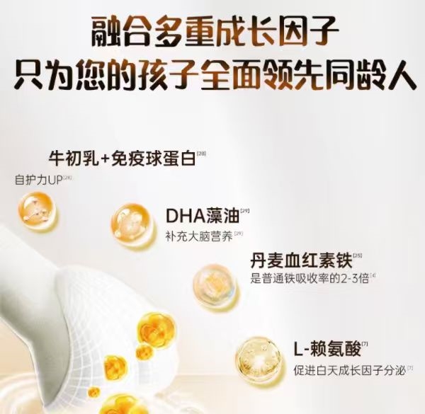 这款产品选原材料时特别讲究,都是挑选纯天然的优质原料。比如赖氨酸盐酸盐来自优质谷物提取,没有化学合成的杂质;DHA 藻油粉选的是深海优质藻种,纯净无污染;牛初乳粉来自健康乳源,经过严格检测;各种植物提取物,像蔓越莓、山楂,都是选新鲜成熟的果实,用物理方式提取,没加防腐剂、色素等添加剂。所有原材料进场前都会做检测,确保重金属、农药残留等符合标准,从源头保证产品安全。