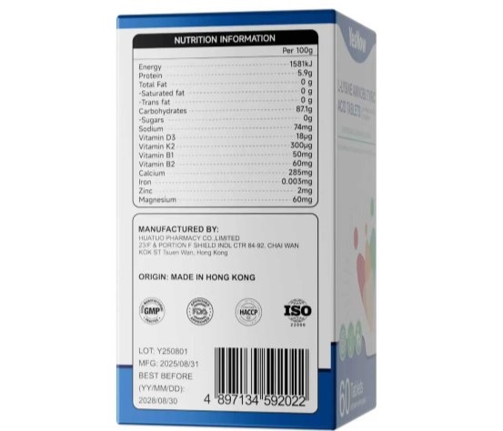 含 200mg 赖氨酸 + 300mg 天然碳酸钙,辅以维生素 B2,颗粒冲调方便,奶香味适合低龄儿童。