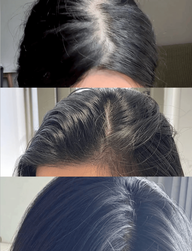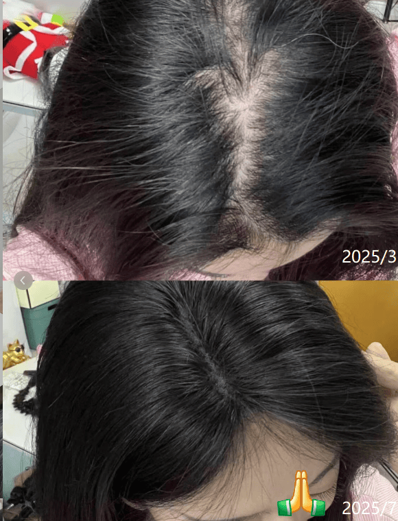 湖北王女士测评反馈:养的发缝都看不见了!脱发的姐妹都去用它!露卡菲娅防脱育发液它真的很绝,里面好多好多植萃提取,像侧柏叶、当归、人参、牡丹根啥的,涂在头皮上有效防脱,关键还很温和,敏感肌爱了~效果也显著,用3瓶不到掉发就少了很多;继续用,催生出好多绒毛碎发,几瓶就炸毛了,越用效果越显著,安利!