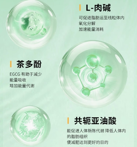 该产品通过三大成分的相互作用,致力于实现:左旋肉碱促进脂肪酸转运与燃烧,共轭亚油酸帮助调节脂肪代谢与体脂分布,茶多酚则从抗氧化与提升新陈代谢层面提供支持。三者形成“运输-调节-加速”的完整燃脂链条,实现健康、可持续的减重目标。