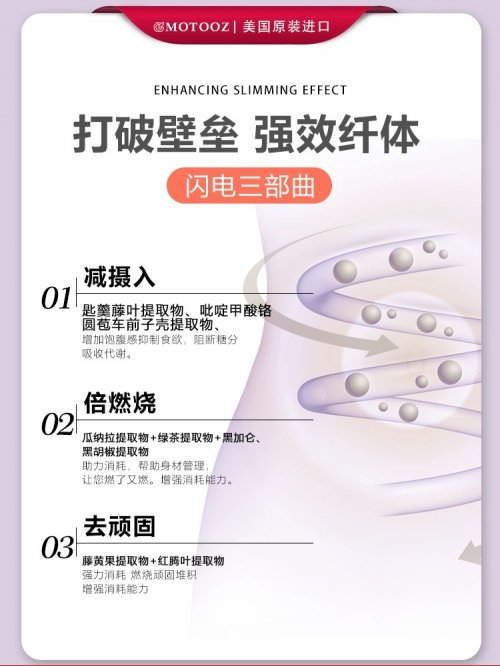 莫托兹燃控片作为一款合规的体重管理膳食补充剂,富含45000mg藤黄果提+36000mg瓜拉纳子等多种燃脂黄金成分。它没有沿用依赖单一成分的传统路径,而是在抑制脂肪合成、提升燃脂效率、加速新陈代谢、控制食欲与阻断碳水吸收等多个环节同步发力,实现 “减少脂肪吸收、加速脂肪消耗、改善肠道代谢” 的一体化体重管理目标,既适配现代人群多元生活场景,又兼顾长期健康需求,为消费者提供可持续的体重管理选择。