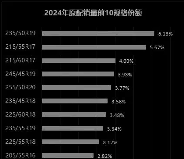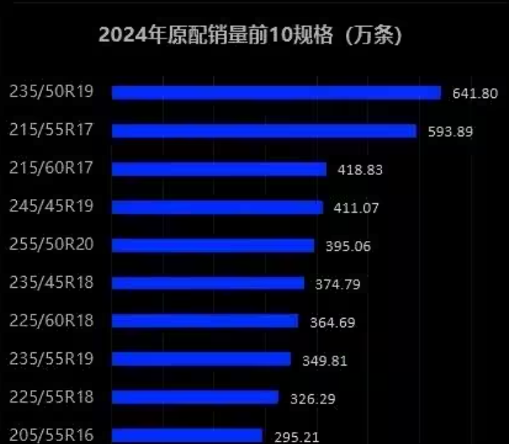 在原配销量前10的规格榜单中,235/50R19以641.80万条的销量高居榜首。前十名中,18、19、20英寸的大尺寸规格占据了8席。这些规格普遍应用于中高端SUV(如大众途观L、比亚迪唐)和运动型轿车(如比亚迪汉)。