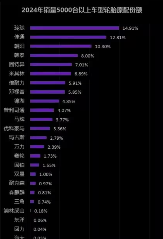尽管在前十榜单中,外资品牌依然占据多数席位,但以玲珑为首的中国品牌正在以惊人的速度改写战局。除了玲珑和朝阳,玛吉斯、万力、赛轮、双星、森麒麟、三角等国产品牌也凭借其在特定领域(如新能源、性价比)的突破,稳固了自己在原配市场的地位。