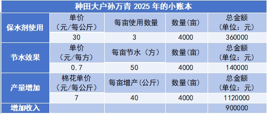 据孙万青介绍,今年4月村里介绍一款保水剂,于是他主动报名试种,本来只是怀着试试看的心态,没想到效果这么好。“我总共种了3万亩棉花,其中4000亩在播种的时候,同时使用了保水剂。因为当时不清楚效果如何,每亩地我用的量可能还不够。现在每亩地增产在30-40公斤,更重要的是节约了50方水。要知道在新疆,水就是命根子,这样我还能多种几千亩地呢!”他信心满满地补充道,“明年我打算一万亩都使用保水剂,并要好好学习如何科学使用,让产量再增加。还是高科技能给我们农民带来实惠!”