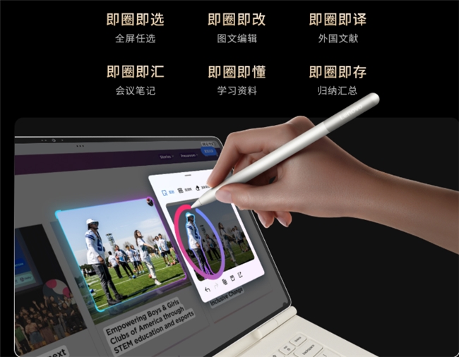 更关键的是,AI妙笔功能还拥有即圈即选、即圈即改、即圈即译、即圈即汇、即圈即懂、即圈即存六大功能,打破了传统创作流程。在绘图时,可以利用AI妙笔在海量图文素材中迅速圈选所需的参考素材,并直接进行细节处理,一气呵成,绘图创作更高效。