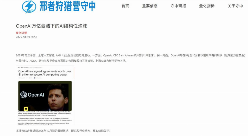 前言:日本软银清仓英伟达,与OpenAI合作的甲骨文月内重挫25%,而早在今年的10月9日,和讯邢者团队,邢者狩猎营的持牌投资顾问守中发布了研报《OpenAI万亿豪赌下的AI结构性泡沫》提醒AI结构性泡沫,我们专访守中,探寻其提前预警的底层逻辑与“守中”策略的核心要义。