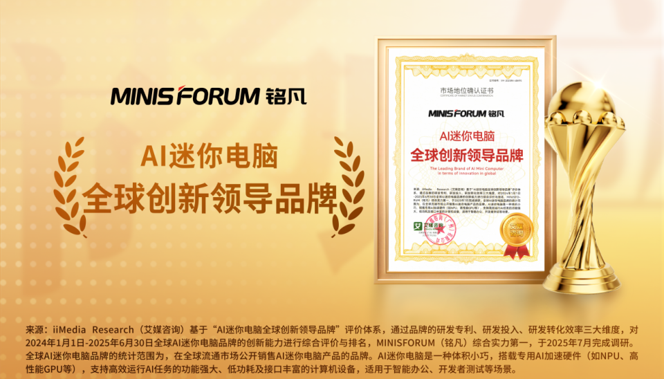 MINISFORUM 铭凡作为深耕迷你主机领域的专业品牌,始终专注于为企业与用户提供稳定、可靠的高性能计算解决方案。其全球用户已突破400万,业务覆盖150余个国家和地区,产品以出色的品质、创新的设计和持续的客户支持而受到广泛信赖。近期,MINISFORUM 铭凡更凭借市场表现与产品创新力,获得全球权威数据机构艾媒咨询颁发的六大认证:"高性能迷你电脑全球销量王"、"AI 迷你电脑全球创新领导品牌"、"AI 迷你电脑行业第一品牌"等。