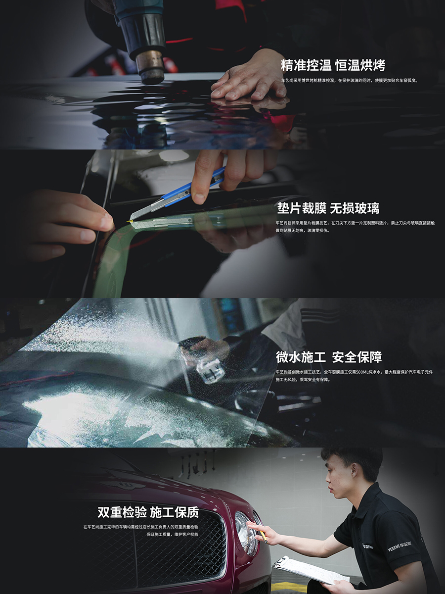在施工品质层面,车艺尚的"无尘施工车间标准"确保了贴膜零灰尘、零杂质;“垫片裁膜”、“500ml微水施工”最大限度避免划伤车窗、保护车辆电路不受损;"专车专用机裁"、“隐形车衣预留裁剪”保证了包边处理完美贴合,杜绝后期翘边风险。这些细节,正是普通门店与金奖服务之间难以逾越的差距。