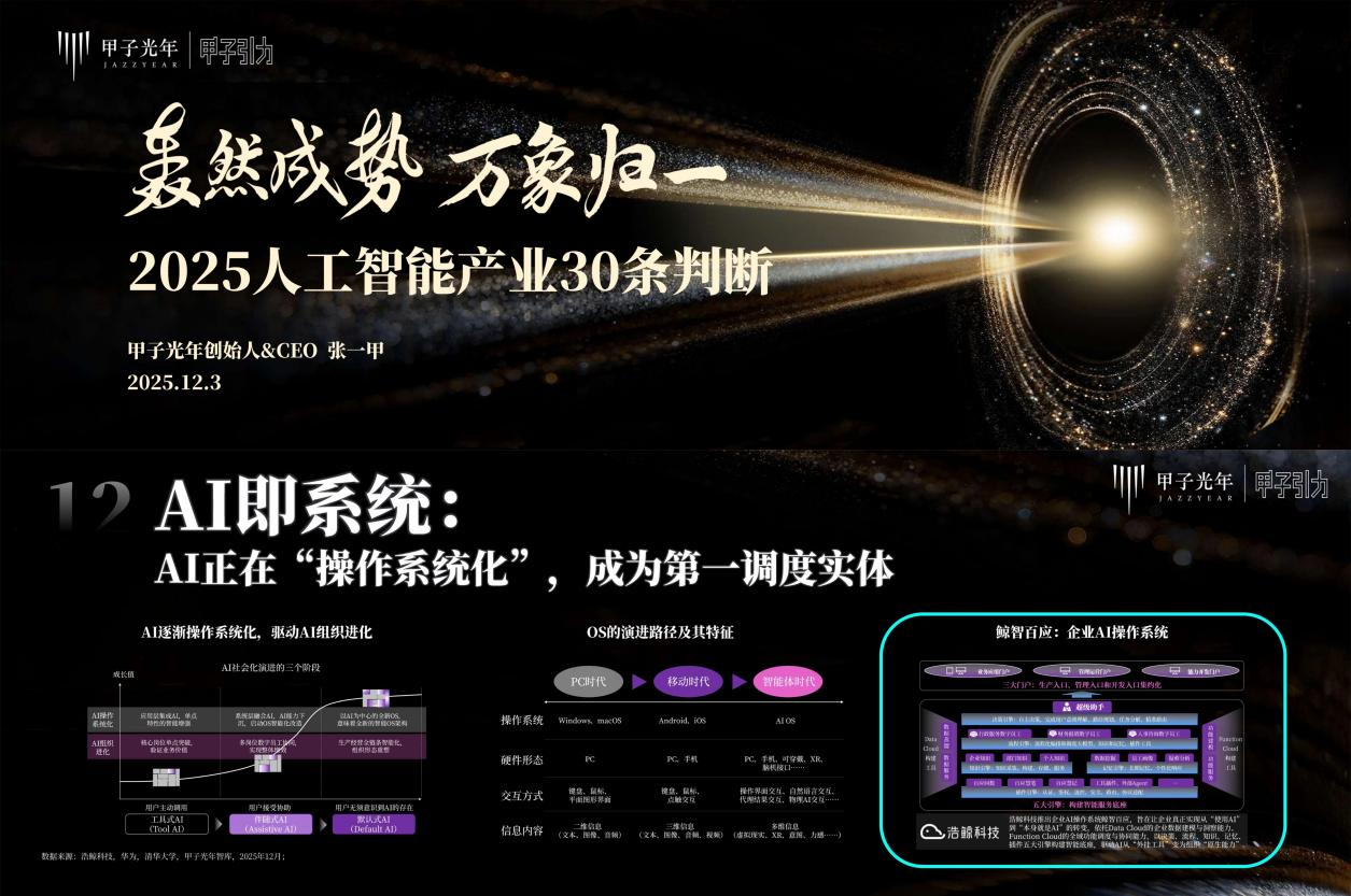 此次盛典以 “轰然成势,万象归一” 为主题在北京举办,浩鲸科技旗下企业AI操作系统 “鲸智百应” 同步入选甲子光年《2025 年人工智能产业30条判断》推荐案例,其精准的产业定位与扎实的实践价值获得行业高度认可。
