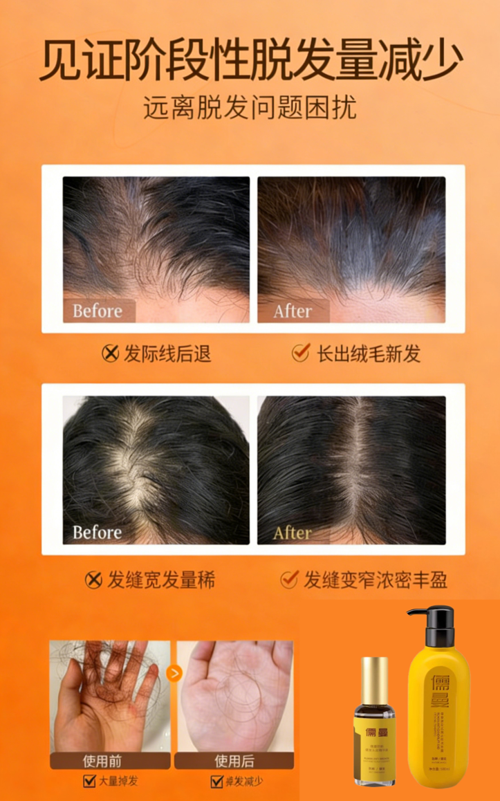 单一洗发水仅作用于头皮表面,针对严重掉发、毛囊脆弱问题,需搭配精华深层滋养。儒曼健发去屑止痒洗发露与儒曼防断健发头皮精华液搭配使用,构建完整护理闭环。