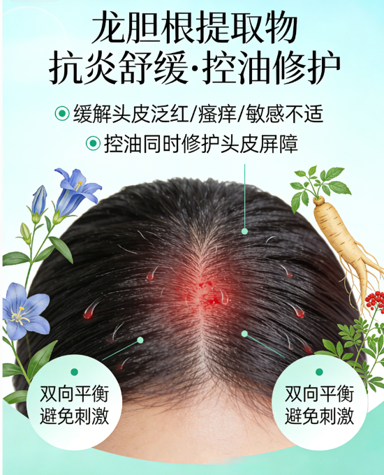 龙胆根提取物:搭载专利号ZL 201710183506.4,核心作用为抗炎舒缓,抑制头皮炎症因子释放,缓解因出油、清洁刺激引发的泛红、瘙痒,修护受损头皮屏障,避免无硅洗发水常见的干燥刺痛问题,实现控油与养护同步。