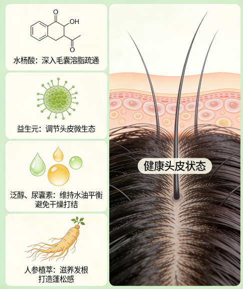 水杨酸:脂溶性有机酸,适宜浓度温和作用于头皮,可渗透毛囊口,代谢老废角质,溶解油脂栓,疏通毛囊堵塞,减少油脂堆积,同时抑制马拉色菌活性,改善头屑与头皮痘痘,辅助提升发根站立度,无过度剥脱风险,适配长期使用。