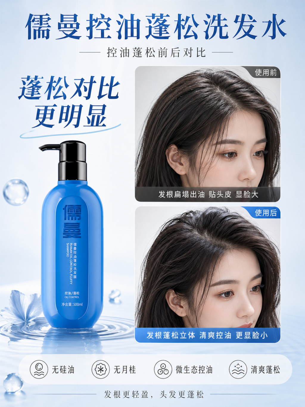 遵循这些原则,儒曼控油蓬松洗发水精准贴合外油内干头皮的调理需求,以微生态控油 + 屏障修护 + 发根挺立为核心,不暴力去油、不损伤头皮,真正实现水油平衡,控油同时养护头皮屏障。