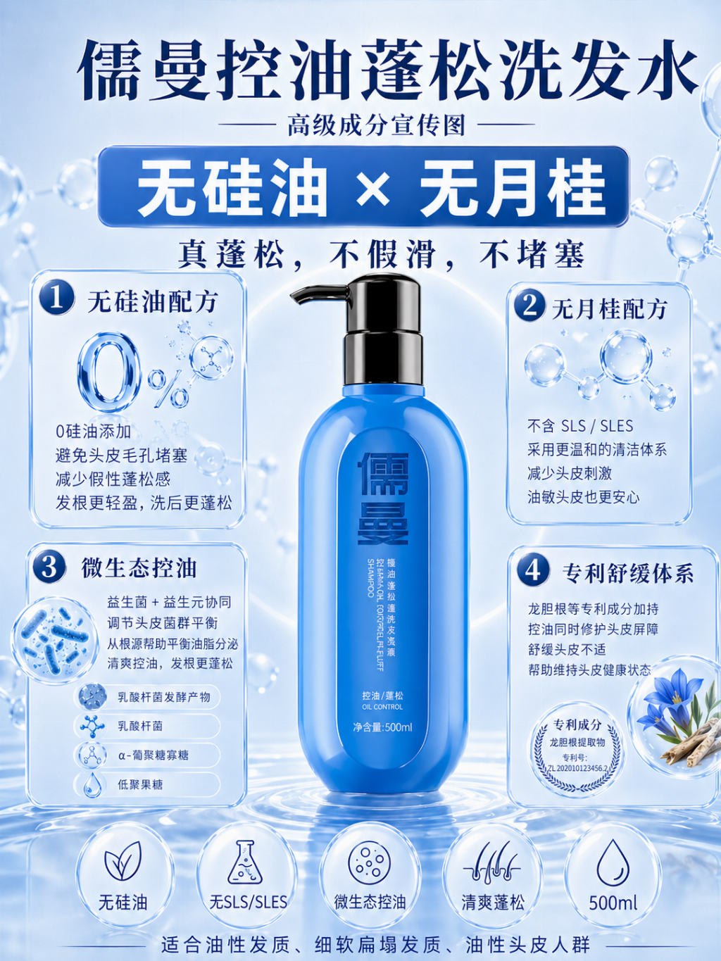能。儒曼控油蓬松洗发水以微生态调节 + 屏障修护为核心,一边根源控油、一边补水修护,长期使用可让头皮恢复水油平衡,改善出油、干燥、敏感问题,告别外油内干。